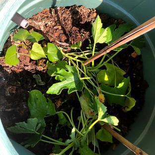 The frost damaged cucumbers outdoors have been doubled up in the grow bags with my spares and really kicked on to the top of the 4 foot stake. Four of my five potatoes in bags are looking really healthy (the Maris Piper one didn't show, so I've put a sweet potato in its place) and the rest of the sweet potatoes are also in...in a tub with a cardboard shoulder so I can get more soil in.